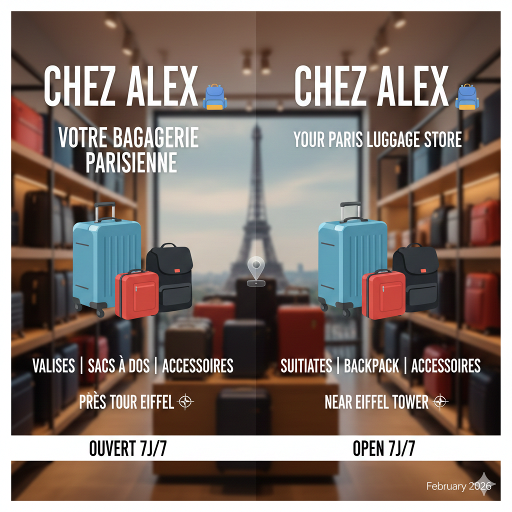 🎒 Chez Alex - Votre Bagagerie au pied de la Tour Eiffel, Bienvenue Chez Alex, votre spécialiste de la bagagerie dans le 7ème arrondissement de Paris. Idéalement située à deux pas de la Tour Eiffel, notre boutique vous propose une large sélection de bagages pour tous vos besoins : • Valises de toutes tailles : Grands formats pour les longs séjours, valises moyennes et valises cabine (EasyJet/Transavia) pour vos voyages en avion. • Pour toute la famille : Un rayon dédié aux valises enfants ludiques et robustes. • Sacs & Maroquinerie : Un grand choix de sacs à dos (travail, loisirs) et de sacs à main pour femmes élégants. • Accessoires : Cadenas TSA, pèse-bagages, housses et sangles pour sécuriser vos déplacements. Ouvert 7j/7 – 8h - 21h00.